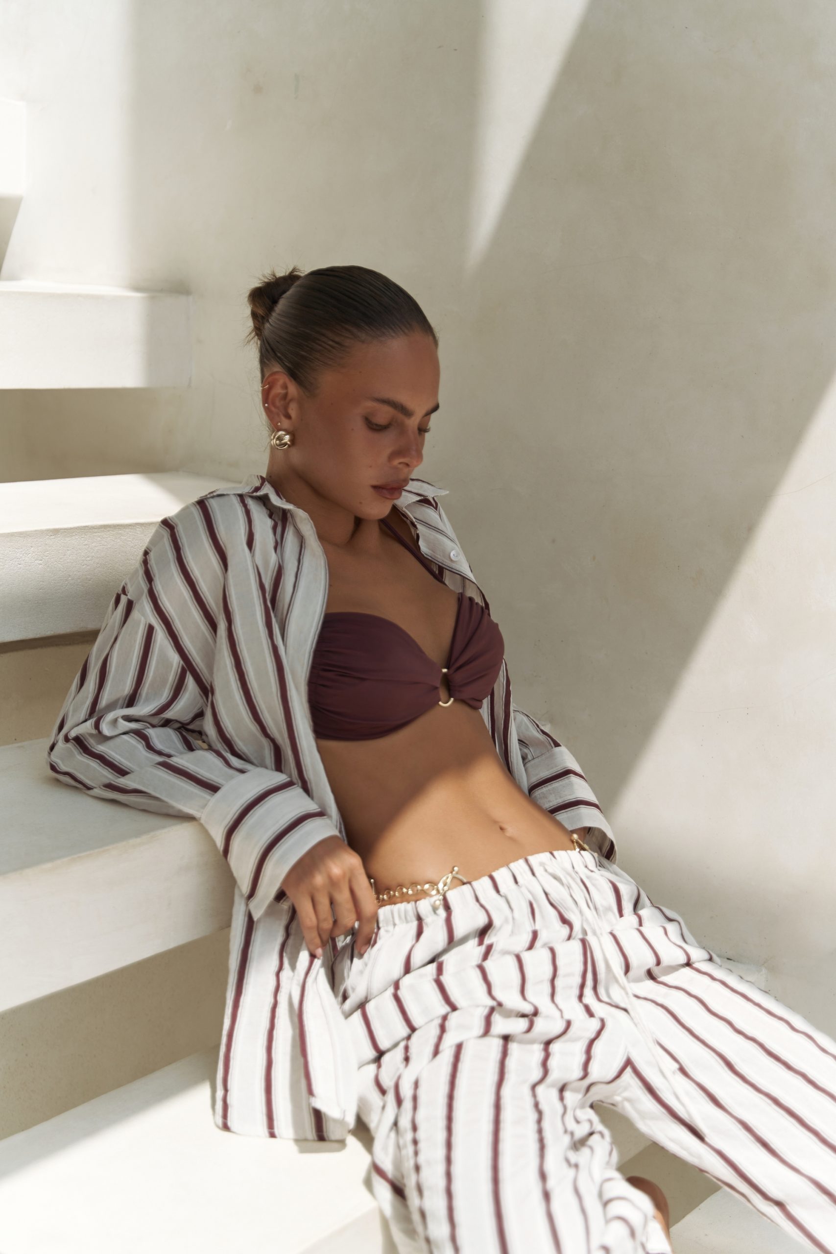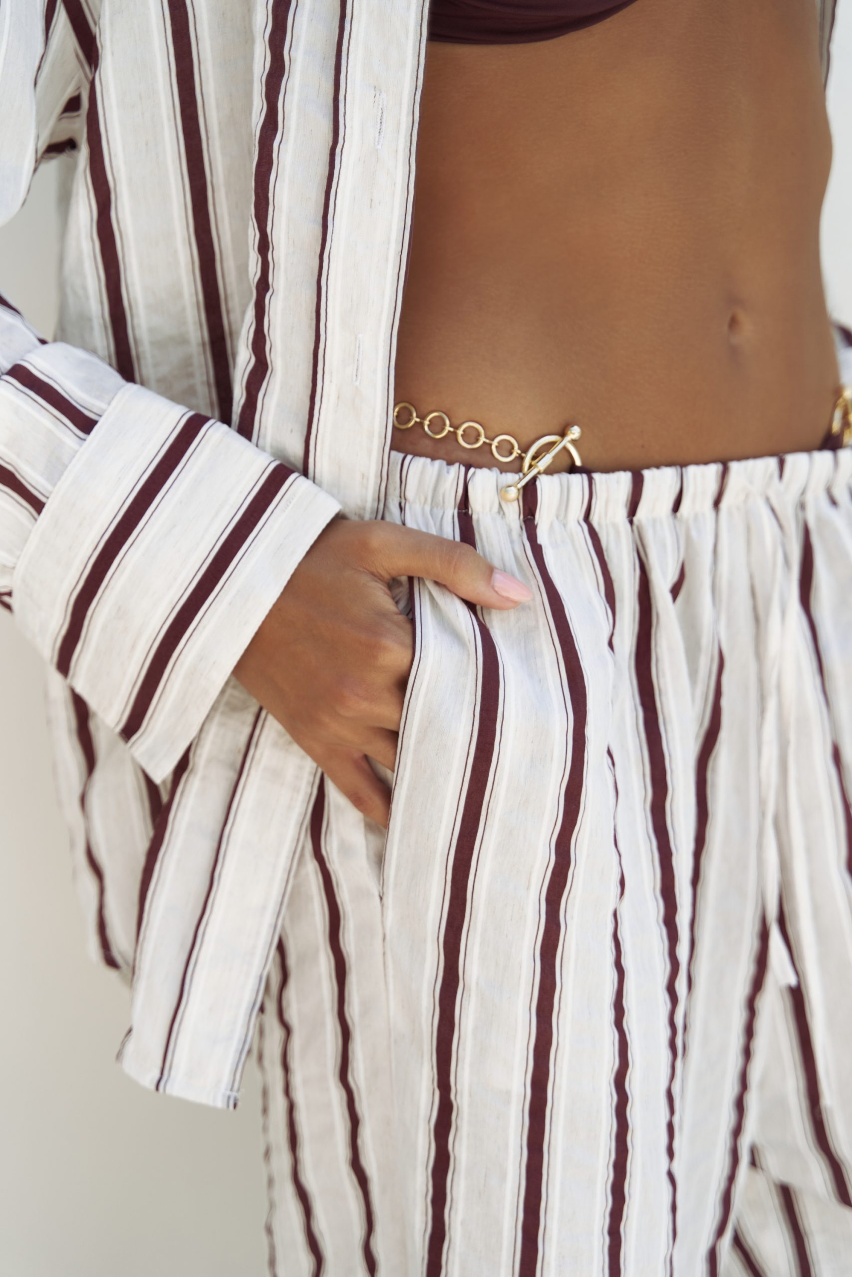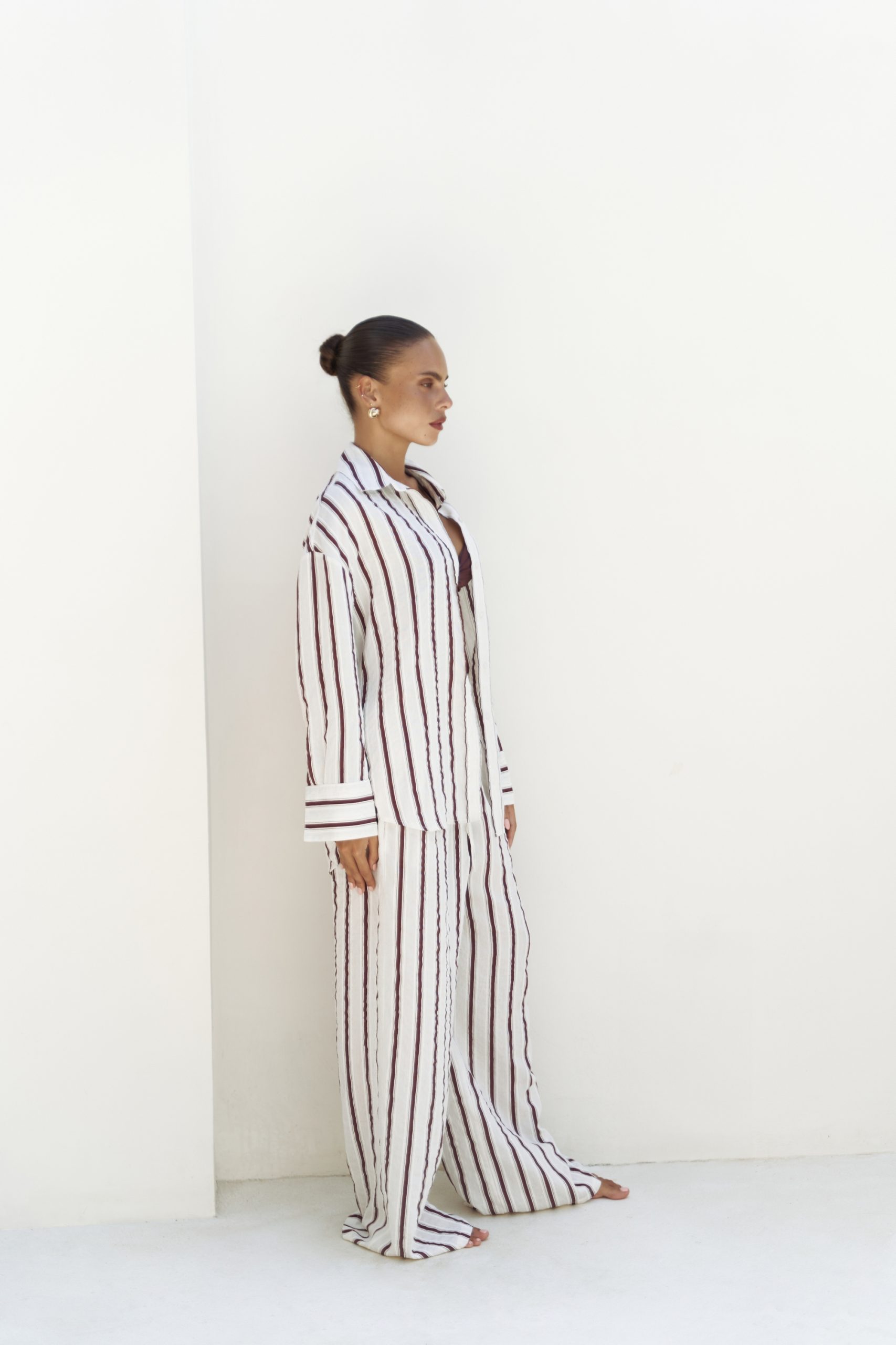Dvodijelni komplet od laganog materijala, lepršave hlače visokog struka i košulja s dugim rukavima.